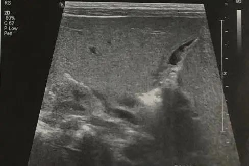 胆道闭锁患儿生后即出现黄疸、进行性加重、皮肤巩膜黄染、面色暗黄、大便淡黄色或白色陶土样等症状。由于新生儿胆总管纤细难以观察,因此通过以下胆囊形态变化判断是否胆道梗阻:胆囊大小正常但形态僵硬(图2),边缘不光整,长度可达2-3cm,内径大于0.4cm,可有小的憩室样结构形成;小胆囊,长度小于1-1.5cm,内径0.2cm,充盈差;胆囊小而且无充盈,仅可见胆囊痕迹,喂奶后无变化;以上三种胆囊均可合并有胆总管区囊肿,可与胆囊管及胆囊相通,但与肝左、右管不相通(见图3);小部分病例可见到肝内胆管局限性扩张(图4);病程后期(3个月以上),显示肝硬化改变(图5)。