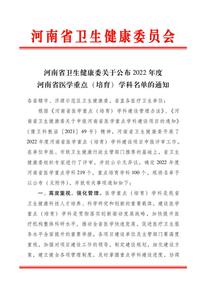稳居全省第三!郑州大学第二附属医院新增12个省级重点(培育)学科