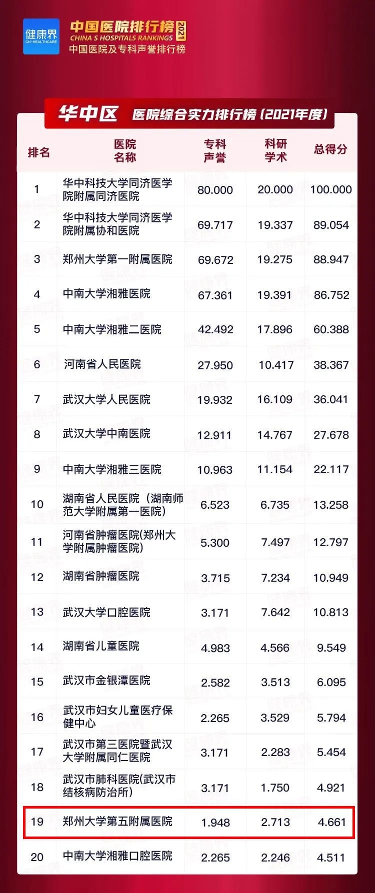 日前,复旦版《2021年度中国医院排行榜》发布,郑州大学五附院再次上榜,位列华中区医院综合实力排行榜第19名(河南省综合医院第3名)。