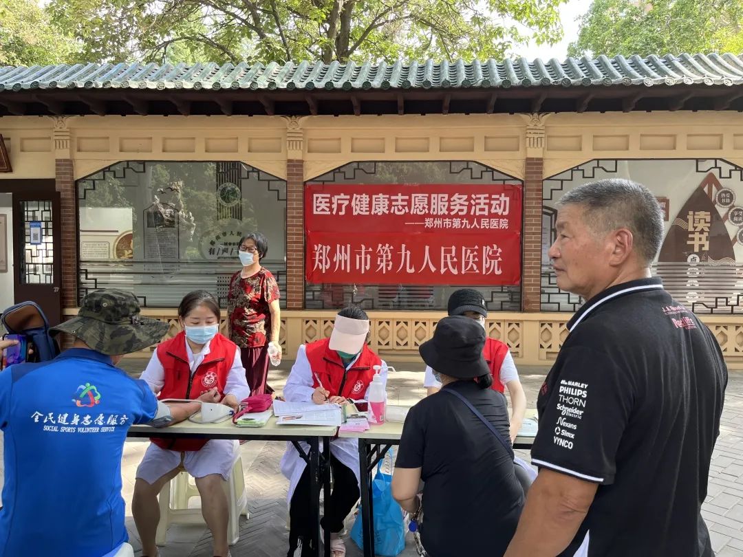6月19日上午9时,郑州市第九人民医院医养结合发展部主任张长安带领医疗健康志愿服务队一行6人,来到郑州市人民公园开展公益义诊活动。
