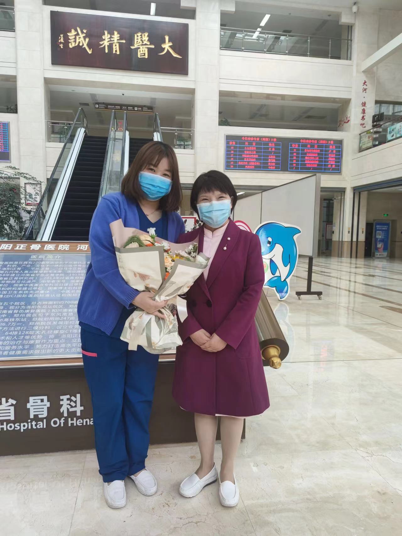 特殊时期,特殊任务,杨雪护士长用实际行动身先士卒,敢为人先,是践行医务人员的职责和使命,也是为战役贡献自己的力量!她说:在这个特殊的日子里,作为一名共产党员,能够冲锋上阵,就是给自己很好的礼物!护理部吴松梅主任也为杨雪护士长送上了鲜花和节日的礼物。