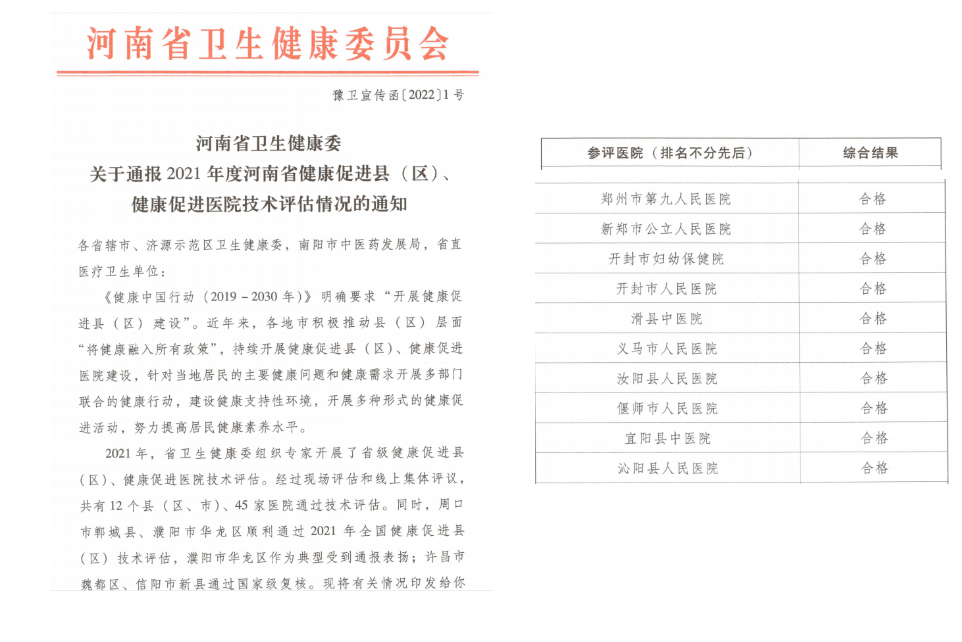 日前,河南省卫生健康委发出关于2021年度河南省健康促进医院评估结果,郑州市第九人民医院在省级健康促进医院创建工作中喜获佳绩,顺利通过省专家组考评验收,达到河南省健康促进医院建设标准。