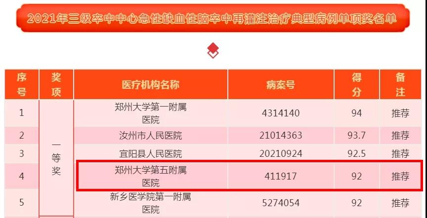 郑州大学五附院脑卒中管理办公室积极号召各卒中相关科室报送适宜技术病案参选,经过多层公平公正的筛选审核后,医院参选的单纯静脉溶栓技术病案(主管医师神经内科一病区田小瑞)获得“2021年三级卒中中心急性缺血性脑卒中再灌注治疗典型病例单项奖一等奖”,颈动脉支架植入术技术病案(主管医师介入科刘凯)获得“2021年三级卒中中心颈动脉狭窄典型病例单项奖一等奖”。