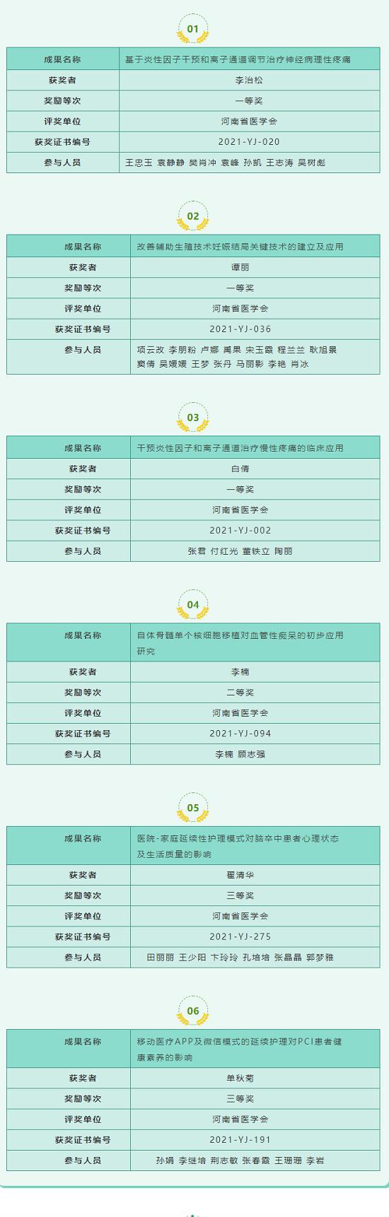 9月18日,河南省医学会发布《河南省医学会关于2021年河南医学科技奖奖励的决定》,郑州大学第二附属医院共获奖6项,其中一等奖3项,二等奖1项,三等奖2项。
